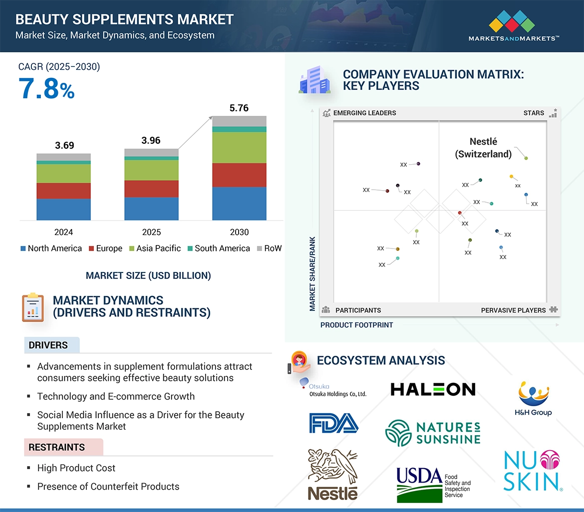 The beauty supplements market is estimated at USD 3.96 billion in 2025 and is projected to reach USD 5.76 billion by 2030, at a CAGR of 7.8% from 2025 to 2030. The beauty supplement category is witnessing robust growth, underpinned by growing consumer concern for skin, hair, and overall health. The growing affinity for natural and plant-based products has spurred demand for supplements catering to hydration, anti-aging, and hair care. Social media influence and the trend towards holistic beauty products are prompting consumers to opt for products high in collagen substitutes, antioxidants, and essential vitamins. With increasing emphasis on sustainability and ethically sourced ingredients, beauty supplements are transforming to address clean-label and cruelty-free needs and thus become an essential component of contemporary skincare and wellness regimens.