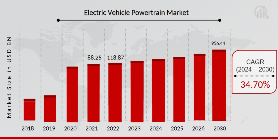 The latest market report on Electric Vehicle Powertrain Market published by Market research Future suggests, Electric Vehicle Powertrain Market Size was valued at USD 88.25 billion in 2021. The Global Electric Vehicle Powertrain market is projected to grow from USD 118.87 Billion in 2022 to USD 956.44 billion by 2030, exhibiting a compound annual growth rate (CAGR) of 34.70% during the forecast period (2024–2030).