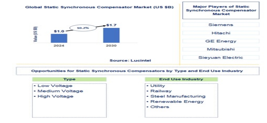 According to a market report by Lucintel, the future of the global static synchronous compensator market looks promising with opportunities in the utility, railway, steel manufacturing, and renewable energy markets. The global static synchronous compensator market is expected to reach an estimated $1.7 billion by 2031 from $1.0 billion in 2025, at a CAGR of 10.2% from 2025 to 2031. The major drivers for this market are the growing demand for renewable electricity, rising demand for smart grid infrastructure and smart meter roll outs, and increasing government initiatives to modernize power infrastructure.