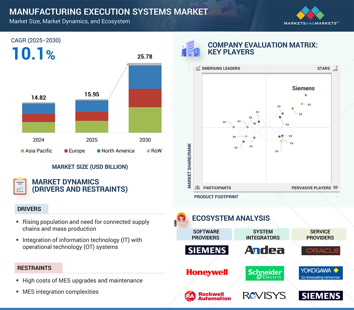 According to a research report “Manufacturing Execution System Market by Deployment Mode (On-premises, Cloud, Hybrid), Application (Production Management, Quality Management, Material and Inventory Management, Maintenance Management, Performance Analysis) – Global Forecast to 2030” The global manufacturing execution systems market is expected to grow from USD 15.95 billion in 2025 to USD 25.78 billion in 2030, with a CAGR of 10.1%.