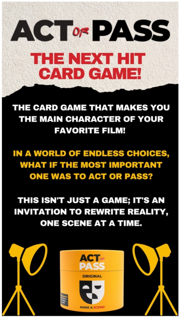 Act or Pass is a brand-new card game that challenges players to act out famous scenes, funny prompts, or ridiculous scenarios while their team guesses the correct answer before time runs out. Perfect for 4–10 players, ages 13+, each gameplay lasts 30 to 60 minutes of non-stop fun and creativity. Designed to be lighthearted and easy to play, it’s the ultimate game night addition for families, friends, students, coworkers, or anyone looking to break the ice and make memories.