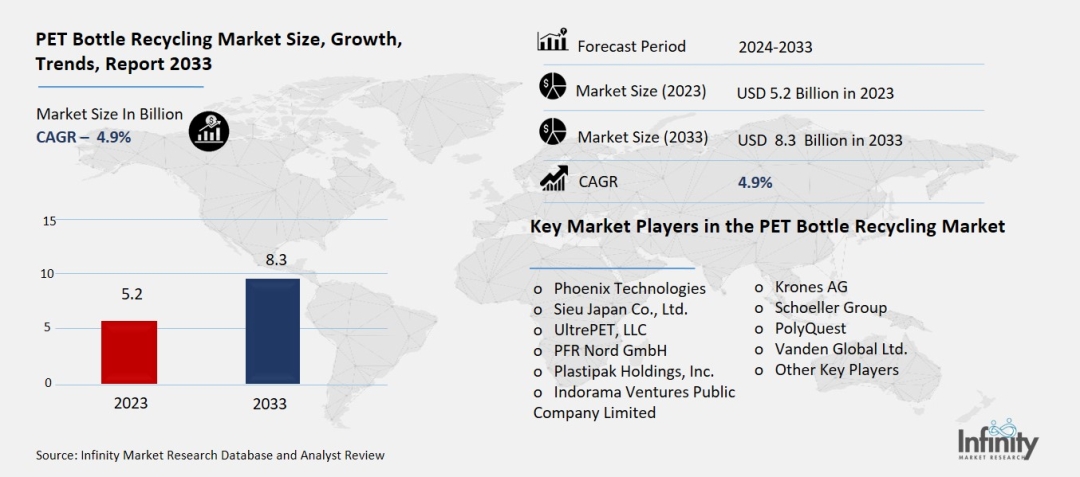 The Global PET Bottle Recycling Market generated a substantial revenue of USD 5.2 billion in 2023 and is projected to reach approximately USD 8.3 billion by 2033, reflecting a CAGR of 4.9% over the forecast period from 2024 to 2033.