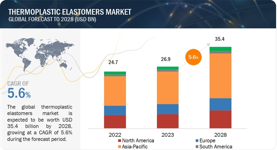 The global TPE market size was USD 26.9 billion in 2023 and is projected to reach USD 35.4 billion by 2028, at a CAGR of 5.6% between 2023 and 2028. This report provides a comprehensive analysis of industry, including market size, share, TPE market growth, trends, drivers and constraints, competitive aspects, and prospects for future growth. Automotive is the major application segment for TPE. The automotive industry grapples with increasing pressure to adopt eco-friendly practices and materials, TPEs align well with sustainability objectives. They are recyclable and have a reduced environmental impact compared to some alternatives, contributing to the industry’s drive for greener, more sustainable transportation solutions.