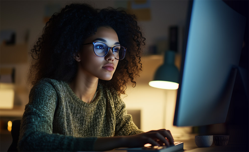 Workers that spend their days using computers benefit from blue light blocking glasses.